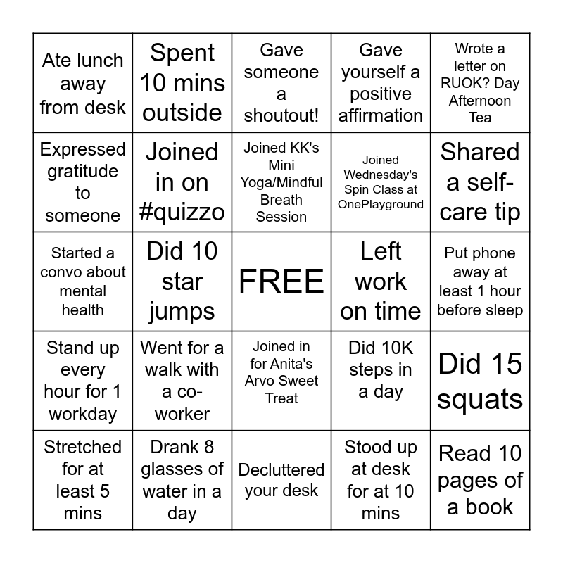 This bingo card has a free space and 24 words: Went for a walk with a co-worker, Drank 8 glasses of water in a day, Joined KK's Mini Yoga/Mindful Breath Session, Stretched for at least 5 mins, Wrote a letter on RUOK? Day Afternoon Tea, Ate lunch away from desk, Expressed gratitude to someone, Spent 10 mins outside, Left work on time, Joined in for Anita's Arvo Sweet Treat, Joined Wednesday's Spin Class at OnePlayground, Started a convo about mental health, Did 10K steps in a day, Did 15 squats, Joined in on #quizzo, Stood up at desk for at 10 mins, Put phone away at least 1 hour before sleep, Gave someone a shoutout!, Shared a self-care tip, Did 10 star jumps, Read 10 pages of a book, Stand up every hour for 1 workday, Gave yourself a positive affirmation and Decluttered your desk.