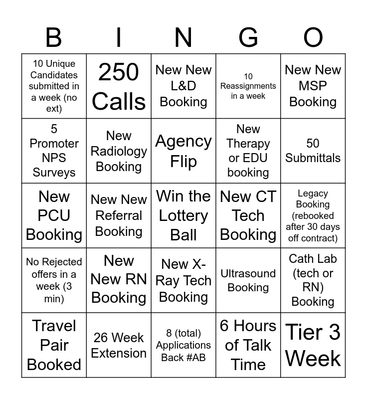 This bingo card has a free space and 24 words: New New RN Booking, 26 Week Extension, Agency Flip, Travel Pair Booked, New New MSP Booking, 10 Unique Candidates submitted in a week (no ext), 5 Promoter NPS Surveys, 250 Calls, New CT Tech Booking, New X-Ray Tech Booking, New Therapy or EDU booking, New PCU Booking, Ultrasound Booking, Cath Lab (tech or RN) Booking, New Radiology Booking, 6 Hours of Talk Time, Legacy Booking (rebooked after 30 days off contract), New New L&D Booking, 50 Submittals, New New Referral Booking, Tier 3 Week, No Rejected offers in a week (3 min), 10 Reassignments in a week and 8 (total) Applications Back #AB.