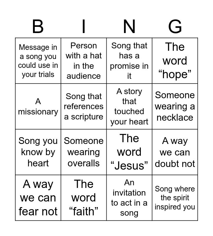This bingo card has 27 words: Free!, Song you don’t know, Song you know by heart, Artist you recognize, Song that references a scripture, Song that has a promise in it, Person with a hat in the audience, Song where the spirit inspired you, The word “faith”, The word “love”, The word “Jesus”, The word “hope”, The word “pray”, A girl wearing a pink shirt, Someone wearing overalls, Cool dance move (moonwalk!??), A story that touched your heart, Someone wearing a necklace, Instrument other than guitar, Message in a song you could use in your trials, An invitation to act in a song, A way to look unto Christ, A way we can doubt not, A way we can fear not, Man with a blue shirt, A missionary and Cool light show.