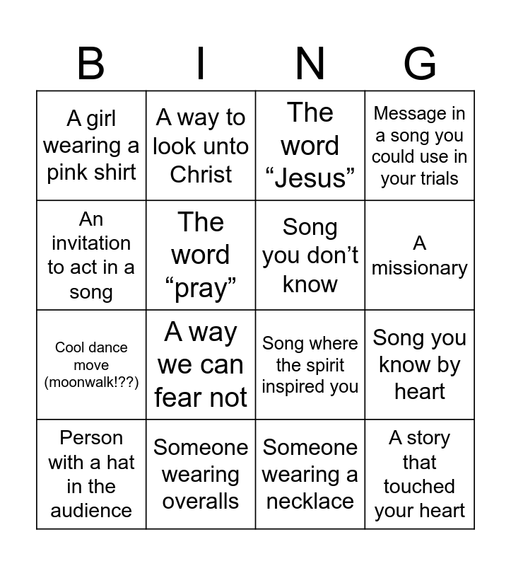 This bingo card has 27 words: Free!, Man with a blue shirt, Cool dance move (moonwalk!??), The word “love”, The word “pray”, The word “Jesus”, A way to look unto Christ, A story that touched your heart, Someone wearing overalls, Artist you recognize, Song where the spirit inspired you, Message in a song you could use in your trials, A way we can doubt not, The word “hope”, A way we can fear not, Cool light show, Song you don’t know, A missionary, Song that references a scripture, A girl wearing a pink shirt, Someone wearing a necklace, Song that has a promise in it, Song you know by heart, Person with a hat in the audience, The word “faith”, An invitation to act in a song and Instrument other than guitar.