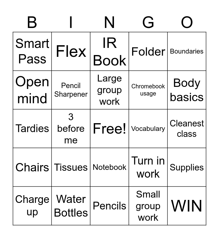 This bingo card has a free space and 24 words: Tissues, Water Bottles, Large group work, Charge up, Boundaries, Smart Pass, Open mind, Flex, Vocabulary, Notebook, Chromebook usage, Tardies, Turn in work, Supplies, Pencil Sharpener, Small group work, Cleanest class, IR Book, Body basics, 3 before me, WIN, Chairs, Folder and Pencils.