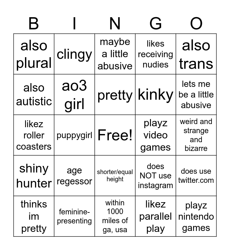 This bingo card has a free space and 24 words: age regessor, feminine-presenting, pretty, thinks im pretty, also trans, also plural, also autistic, clingy, playz video games, shorter/equal height, kinky, likez roller coasters, does NOT use instagram, does use twitter.com, ao3 girl, likez parallel play, weird and strange and bizarre, maybe a little abusive, lets me be a little abusive, puppygirl, playz nintendo games, shiny hunter, likes receiving nudies and within 1000 miles of ga, usa.