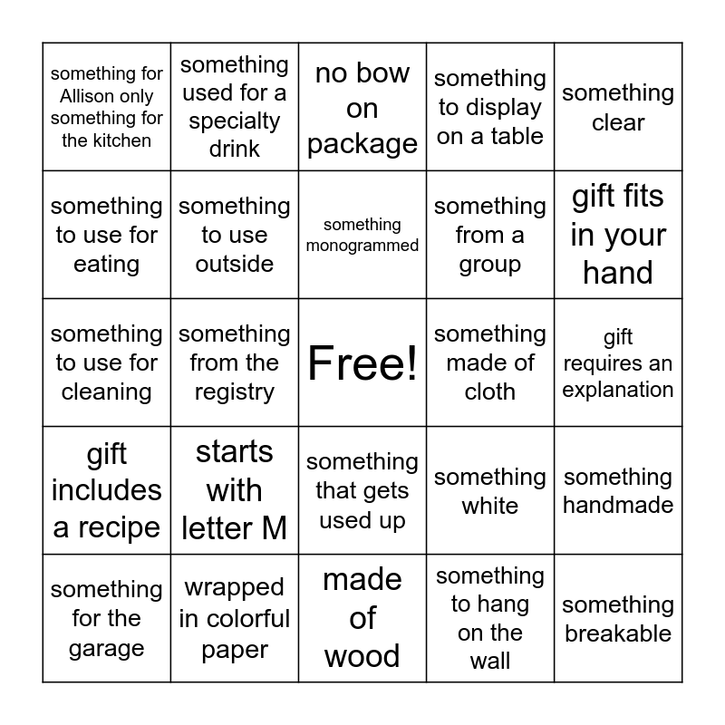 This bingo card has a free space and 35 words: contains a set of items, something used for baking, includes a gift receipt, something to use outside, something that gets used up, something to display on a table, something to use for eating, something not on the registry, something monogrammed, has an on/off switch, something to use for cleaning, something clear, something blue, something for Cody only, something for Allison only something for the kitchen, something made of cloth, something to hang on the wall, something from the registry, gift includes a recipe, something breakable, something white, something for the garage, something handmade, wrapped in colorful paper, no bow on package, gift fits in your hand, gift starts with letter C, gift starts with letter T, something from a group, gift requires an explanation, something made of cotton, made of wood, starts with letter M, something used for a specialty drink and something for serving.