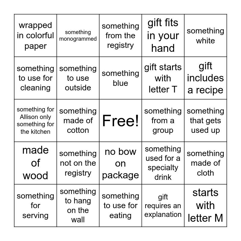 This bingo card has a free space and 35 words: contains a set of items, something used for baking, includes a gift receipt, something to use outside, no bow on package, gift fits in your hand, something to use for cleaning, something clear, something blue, something for Cody only, something for Allison only something for the kitchen, something white, something for the garage, something handmade, wrapped in colorful paper, something from a group, gift requires an explanation, something made of cotton, made of wood, starts with letter M, something used for a specialty drink, something for serving, something made of cloth, something to hang on the wall, something from the registry, gift includes a recipe, something breakable, gift starts with letter C, gift starts with letter T, something that gets used up, something to display on a table, something to use for eating, something not on the registry, something monogrammed and has an on/off switch.