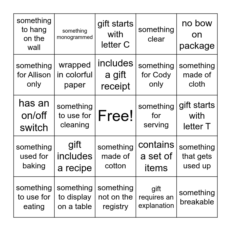 This bingo card has a free space and 36 words: something white, something for the garage, something handmade, wrapped in colorful paper, contains a set of items, something used for baking, includes a gift receipt, something to use outside, no bow on package, gift fits in your hand, something to use for cleaning, something clear, something used for a specialty drink, something for serving, something made of cloth, something to hang on the wall, something from the registry, gift includes a recipe, something breakable, gift starts with letter C, gift starts with letter T, something that gets used up, something to display on a table, something to use for eating, something not on the registry, something monogrammed, has an on/off switch, something blue, something for Cody only, something for Allison only, something for the kitchen, something from a group, gift requires an explanation, something made of cotton, made of wood and starts with letter M.