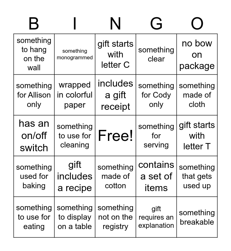 This bingo card has a free space and 36 words: something white, something for the garage, something handmade, wrapped in colorful paper, contains a set of items, something used for baking, includes a gift receipt, something to use outside, no bow on package, gift fits in your hand, something to use for cleaning, something clear, something used for a specialty drink, something for serving, something made of cloth, something to hang on the wall, something from the registry, gift includes a recipe, something breakable, gift starts with letter C, gift starts with letter T, something that gets used up, something to display on a table, something to use for eating, something not on the registry, something monogrammed, has an on/off switch, something blue, something for Cody only, something for Allison only, something for the kitchen, something from a group, gift requires an explanation, something made of cotton, made of wood and starts with letter M.
