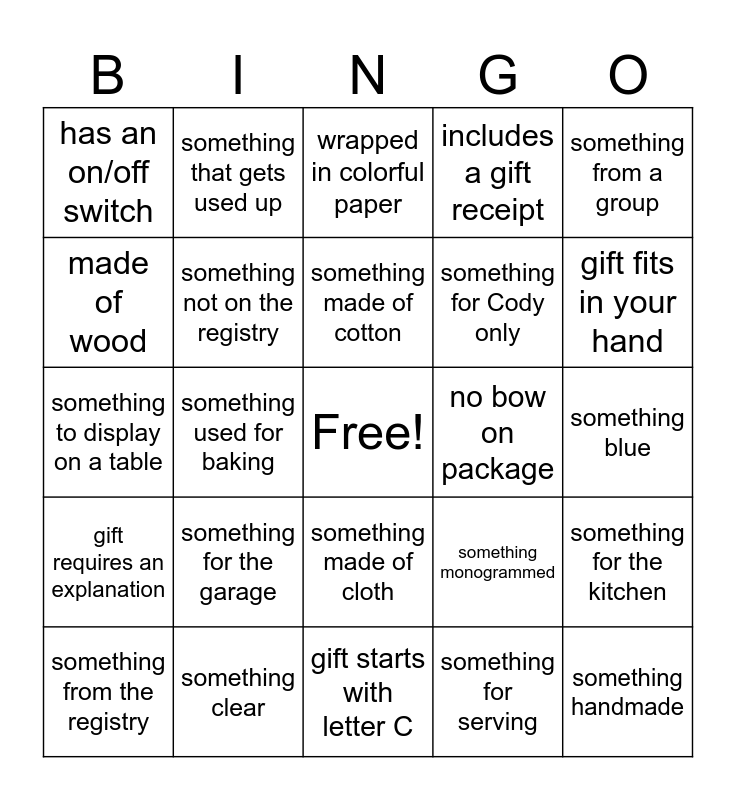 This bingo card has a free space and 36 words: gift includes a recipe, something breakable, gift starts with letter T, something not on the registry, something monogrammed, gift requires an explanation, something made of cotton, something for Allison only, something from a group, something to hang on the wall, something used for baking, includes a gift receipt, something to use outside, no bow on package, gift fits in your hand, has an on/off switch, something white, something for the garage, something handmade, wrapped in colorful paper, something blue, something for the kitchen, something clear, something from the registry, gift starts with letter C, something that gets used up, something to display on a table, something to use for eating, something for Cody only, made of wood, starts with letter M, something used for a specialty drink, something for serving, something made of cloth, contains a set of items and something to use for cleaning.