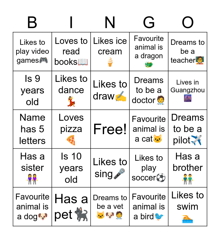 This bingo card has a free space and 24 words: Is 10 years old, Has a pet🐈⬛, Likes to draw✍️, Favourite animal is a dog🐶, Dreams to be a teacher🧑🏫, Likes to play video games🎮, Is 9 years old, Loves to read books📖, Favourite animal is a cat🐱, Likes to sing🎤, Dreams to be a doctor🧑⚕️, Name has 5 letters, Likes to play soccer⚽️, Has a brother👬, Likes to dance💃, Favourite animal is a bird🐦, Dreams to be a pilot✈️, Likes ice cream🍦, Lives in Guangzhou🌆, Loves pizza🍕, Likes to swim🏊, Has a sister👭, Favourite animal is a dragon🐲 and Dreams to be a vet🐱🐶🧑⚕️.