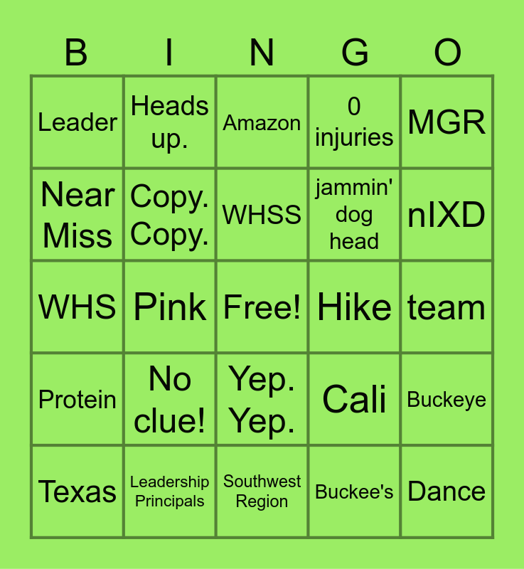 This bingo card has a free space and 35 words: Howdy. Howdy., Hey. Hey., Are you tracking?, Copy. Copy., Yep. Yep., 0 injuries, Near Miss, OMR, WHSS, WHSM, WHS, MGR, AGMA, L5, Leader, Hike, Buckee's, Pink, Protein, Dance, Cali, Texas, Buckeye, Leadership Principals, Amazon, nIXD, +1, TY, jammin' dog head, team, Boom!, Southwest Region, No clue!, Heads up. and pilot.