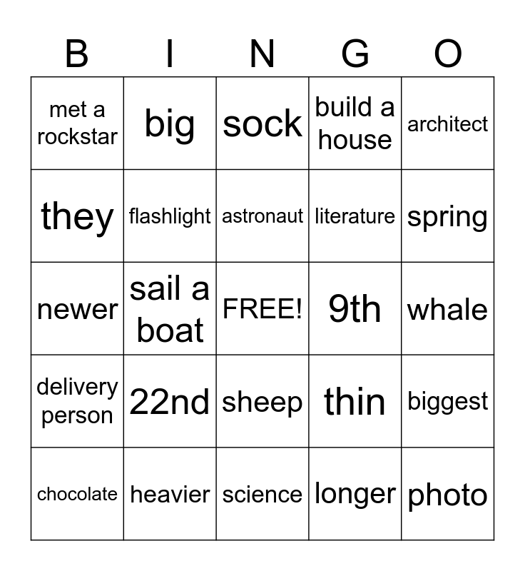 This bingo card has a free space and 39 words: fishing rod, helmet, swimsuit, flashlight, chocolate, sheep, astronaut, writer, architect, delivery person, sail a boat, build a house, photo, whale, 9th, 22nd, had a party, met a rockstar, took a test, thin, they, science, literature, spring, foggy, humid, autumn, heavier, longest, big, new, duck, sock, heavier, longer, bigger, biggest, newer and heavy.