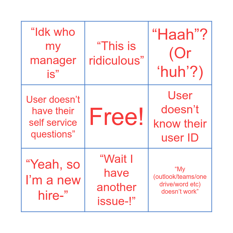 This bingo card has a free space and 8 words: User doesn’t know their user ID, “Haah”? (Or ‘huh’?), “This is ridiculous”, “Yeah, so I’m a new hire-”, “Idk who my manager is”, “My (outlook/teams/one drive/word etc) doesn’t work”, User doesn’t have their self service questions” and “Wait I have another issue-!”.