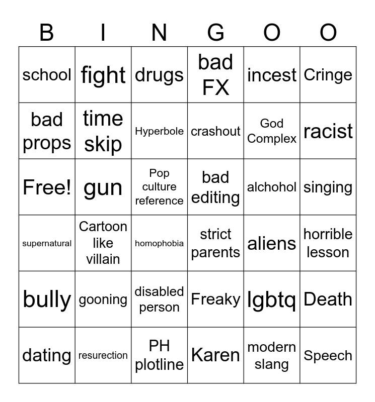 This bingo card has 36 words: Freaky, disabled person, Karen, bad props, supernatural, bad editing, time skip, PH plotline, incest, lgbtq, racist, bad FX, Death, gun, crashout, school, bully, alchohol, Free!, drugs, Pop culture reference, Cartoon like villain, strict parents, homophobia, aliens, fight, God Complex, resurection, Hyperbole, Cringe, Speech, dating, horrible lesson, singing, gooning and modern slang.