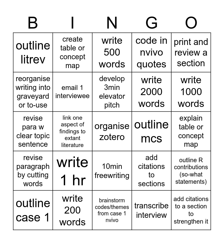 This bingo card has a free space and 24 words: write 1 hr, write 200 words, develop 3min elevator pitch, outline case 1, print and review a section, outline litrev, reorganise writing into graveyard or to-use, create table or concept map, outline mcs, 10min freewriting, write 2000 words, revise para w clear topic sentence, add citations to sections, outline R contributions (so-what statements), email 1 interviewee, transcribe interview, explain table or concept map, write 500 words, write 1000 words, link one aspect of findings to extant literature, add citations to a section to strengthen it, revise paragraph by cutting words, code in nvivo quotes and brainstorm codes/themes from case 1 nvivo.