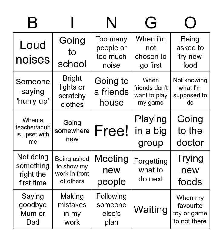 This bingo card has a free space and 29 words: Saying goodbye Mum or Dad, When plans change suddenly, Going somewhere new, Trying new things, Loud noises, Too many people or too much noise, Bright lights or scratchy clothes, Being asked to show my work in front of others, Playing in a big group, Making mistakes in my work, Going to the doctor, When my favourite toy or game to not there, Following someone else's plan, Waiting, Not knowing what I'm supposed to do, Playing with friends, Meeting new people, Not doing something right the first time, Being asked to try new food, When a teacher/adult is upset with me, Forgetting what to do next, Bedtime when it is dark, When friends don't want to play my game, Someone saying 'hurry up', When i'm not chosen to go first, Going to school, Trying new foods, Going to a friends house and Having a fight with a friend.