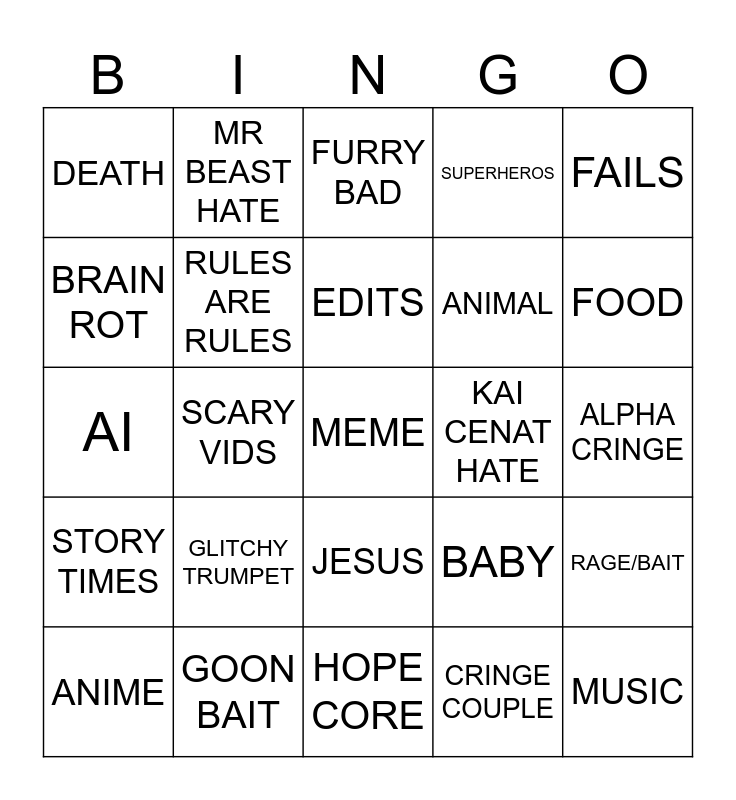 This bingo card has a free space and 24 words: GLITCHY TRUMPET, GOON BAIT, EDITS, ANIME, FAILS, DEATH, BRAIN ROT, MR BEAST HATE, KAI CENAT HATE, JESUS, ANIMAL, AI, BABY, RAGE/BAIT, RULES ARE RULES, CRINGE COUPLE, ALPHA CRINGE, FURRY BAD, FOOD, SCARY VIDS, MUSIC, STORY TIMES, SUPERHEROS and HOPE CORE.