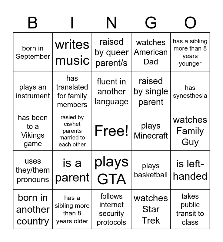 This bingo card has a free space and 24 words: is a parent, has a sibling more than 8 years older, fluent in another language, born in another country, has a sibling more than 8 years younger, born in September, plays an instrument, writes music, plays Minecraft, plays GTA, raised by single parent, has been to a Vikings game, plays basketball, is left-handed, has translated for family members, watches Star Trek, watches Family Guy, raised by queer parent/s, has synesthesia, rasied by cis/het parents married to each other, takes public transit to class, uses they/them pronouns, watches American Dad and follows internet security protocols.