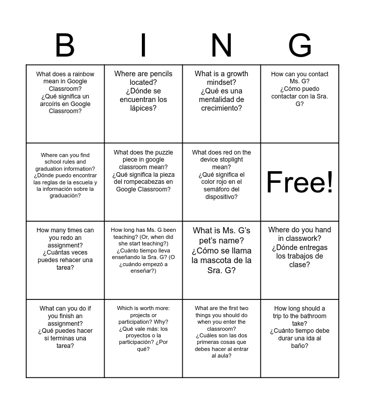 This bingo card has 17 words: What are the first two things you should do when you enter the classroom? ¿Cuáles son las dos primeras cosas que debes hacer al entrar al aula?, What can you do if you finish an assignment? ¿Qué puedes hacer si terminas una tarea?, What is a growth mindset? ¿Qué es una mentalidad de crecimiento?, What does a rainbow mean in Google Classroom? ¿Qué significa un arcoíris en Google Classroom?, How long has Ms. G been teaching? (Or, when did she start teaching?) ¿Cuánto tiempo lleva enseñando la Sra. G? (O ¿cuándo empezó a enseñar?), How can you contact Ms. G? ¿Cómo puedo contactar con la Sra. G?, Where do you hand in classwork? ¿Dónde entregas los trabajos de clase?, What does red on the device stoplight mean? ¿Qué significa el color rojo en el semáforo del dispositivo?, Free!, What does the puzzle piece in google classroom mean? ¿Qué significa la pieza del rompecabezas en Google Classroom?, Which is worth more: projects or participation? Why? ¿Qué vale más: los proyectos o la participación? ¿Por qué?, What is Ms. G’s pet’s name? ¿Cómo se llama la mascota de la Sra. G?, Where can you find school rules and graduation information? ¿Dónde puedo encontrar las reglas de la escuela y la información sobre la graduación?, Where are pencils located? ¿Dónde se encuentran los lápices?, How many times can you redo an assignment? ¿Cuántas veces puedes rehacer una tarea?, What 3 things must you have in class? ¿Cuáles son las 3 cosas que debes tener en clase? and How long should a trip to the bathroom take? ¿Cuánto tiempo debe durar una ida al baño?.