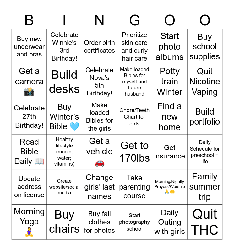 This bingo card has 36 words: Take parenting course, Change girls’ last names, Start photography school, Get a camera 📸, Read Bible Daily 📖, Chore/Teeth Chart for girls, Build desks, Buy fall clothes for photos, Start photo albums, Morning/Nightly Prayers/Worship 🙏🤲, Quit Nicotine Vaping, Prioritize skin care and curly hair care, Family summer trip, Buy Winter’s Bible 🩵, Make loaded Bibles for myself and future husband, Buy new underwear and bras, Update address on license, Find a new home, Celebrate 27th Birthday!, Order birth certificates, Make loaded Bibles for the girls, Healthy lifestyle (meals, water; vitamins), Get to 170lbs, Get a vehicle 🚗, Get insurance, Celebrate Winnie’s 3rd Birthday!, Potty train Winter, Buy chairs, Celebrate Nova’s 5th Birthday!, Buy school supplies, Quit THC, Morning Yoga 🧘♀️, Daily Schedule for preschool + life, Build portfolio, Create website/social media and Daily Outing with girls.