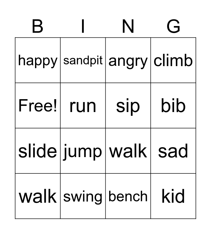 This bingo card has 16 words: swing, sad, angry, happy, slide, sandpit, walk, bench, Free!, run, walk, climb, jump, bib, sip and kid.