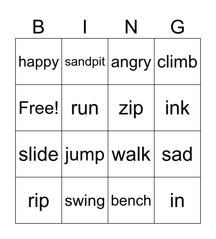 This bingo card has 16 words: swing, sad, angry, happy, slide, sandpit, walk, bench, Free!, run, rip, climb, jump, ink, zip and in.