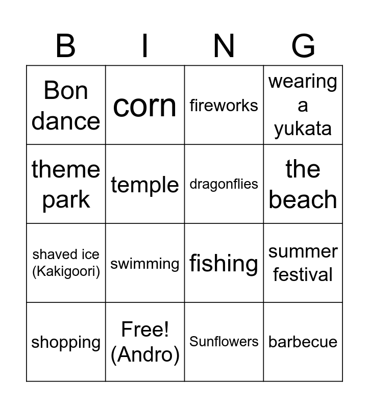 This bingo card has 16 words: Free! (Andro), summer festival, fireworks, Bon dance, shaved ice (Kakigoori), corn, fishing, Sunflowers, theme park, temple, shopping, wearing a yukata, swimming, the beach, dragonflies and barbecue.
