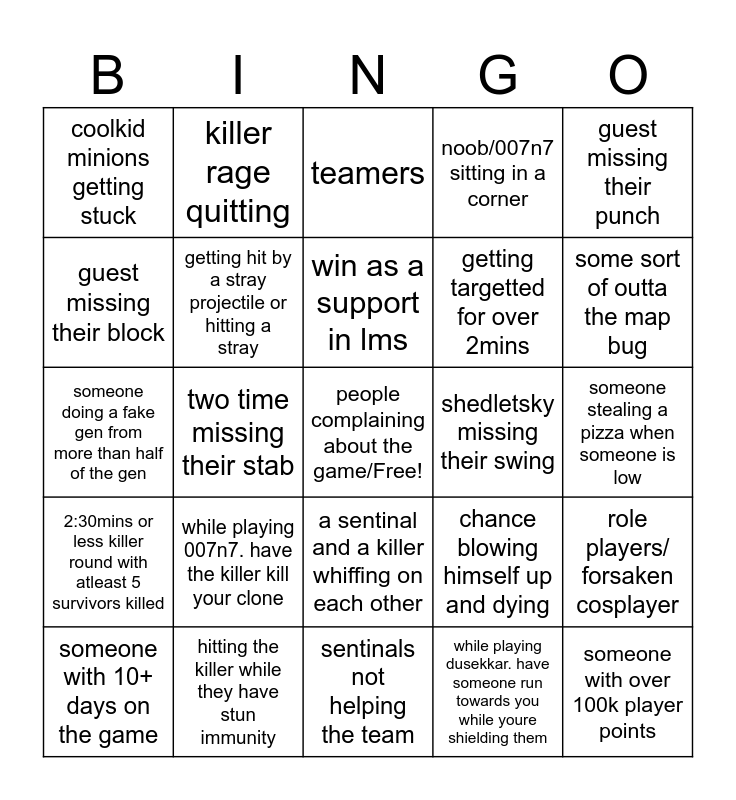 This bingo card has a free space and 24 words: someone with 10+ days on the game, while playing 007n7. have the killer kill your clone, win as a support in lms, while playing dusekkar. have someone run towards you while youre shielding them, guest missing their punch, coolkid minions getting stuck, killer rage quitting, teamers, shedletsky missing their swing, someone stealing a pizza when someone is low, someone doing a fake gen from more than half of the gen, getting hit by a stray projectile or hitting a stray, chance blowing himself up and dying, role players/ forsaken cosplayer, guest missing their block, hitting the killer while they have stun immunity, sentinals not helping the team, noob/007n7 sitting in a corner, some sort of outta the map bug, 2:30mins or less killer round with atleast 5 survivors killed, two time missing their stab, a sentinal and a killer whiffing on each other, getting targetted for over 2mins and someone with over 100k player points.