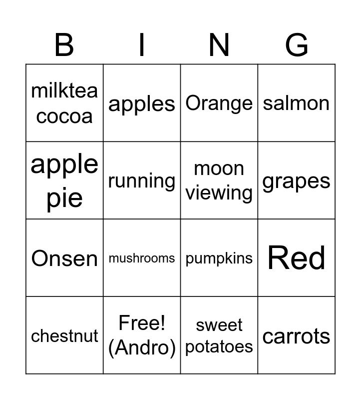 This bingo card has 16 words: Free! (Andro), Red, Orange, milktea cocoa, Onsen, apples, pumpkins, sweet potatoes, apple pie, running, chestnut, salmon, mushrooms, grapes, moon viewing and carrots.