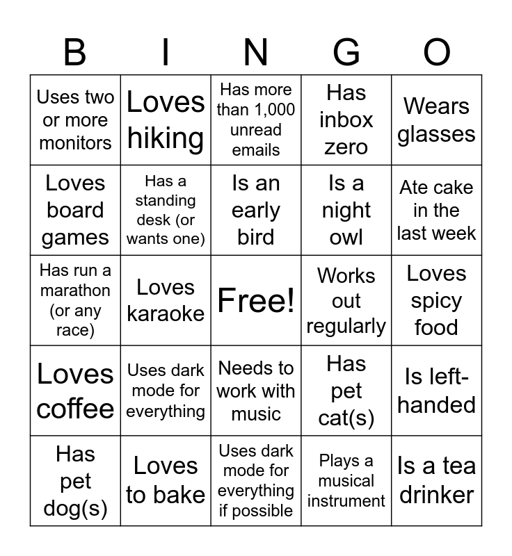 This bingo card has a free space and 24 words: Has pet dog(s), Uses dark mode for everything, Is an early bird, Plays a musical instrument, Wears glasses, Uses two or more monitors, Loves hiking, Has more than 1,000 unread emails, Works out regularly, Loves spicy food, Has run a marathon (or any race), Has a standing desk (or wants one), Has pet cat(s), Is left-handed, Loves board games, Loves to bake, Uses dark mode for everything if possible, Has inbox zero, Ate cake in the last week, Loves coffee, Loves karaoke, Needs to work with music, Is a night owl and Is a tea drinker.