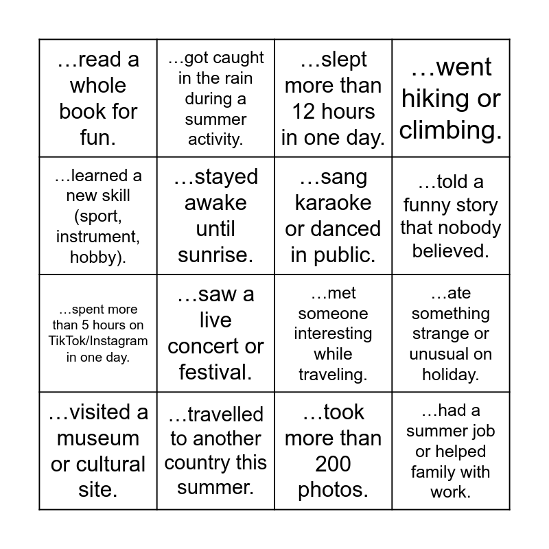 This bingo card has 16 words: …travelled to another country this summer., …ate something strange or unusual on holiday., …slept more than 12 hours in one day., …read a whole book for fun., …spent more than 5 hours on TikTok/Instagram in one day., …got caught in the rain during a summer activity., …met someone interesting while traveling., …took more than 200 photos., …learned a new skill (sport, instrument, hobby)., …stayed awake until sunrise., …visited a museum or cultural site., …went hiking or climbing., …saw a live concert or festival., …told a funny story that nobody believed., …sang karaoke or danced in public. and …had a summer job or helped family with work..