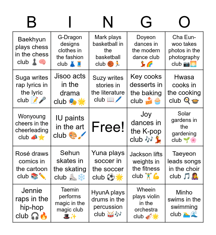 This bingo card has a free space and 33 words: Lisa dances in the dance club πβ¨, Jungkook sings in the music club π€πΆ, IU paints in the art club π¨ποΈ, Taehyung plays guitar in the band club πΈπ΅, RosΓ© draws comics in the cartoon club πβοΈ, Jisoo acts in the drama club ππ, Cha Eun-woo takes photos in the photography club π·π , Jennie raps in the hip-hop club π§π₯, G-Dragon designs clothes in the fashion club ππ§΅, Kai practices taekwondo in the martial arts club π₯π, Suzy writes stories in the literature club πποΈ, Mark plays basketball in the basketball club ππ, Sana plays piano in the piano club πΉπΌ, RM reads books in the book club πβ, Joy dances in the K-pop club πΆπ, Hwasa cooks in the cooking club π³π², Taemin performs magic in the magic club π©β¨, Wonyoung cheers in the cheerleading club π£β, Sehun skates in the skating club βΈοΈβοΈ, Jackson lifts weights in the fitness club ποΈββοΈπͺ, Yuna plays soccer in the soccer club β½π, Hani sings opera in the vocal club πΆπΌ, Baekhyun plays chess in the chess club βοΈπ§ , Solar gardens in the gardening club π±πΈ, HyunA plays drums in the percussion club π₯πΆ, Minho swims in the swimming club πββοΈπ, Doyeon dances in the modern dance club ππ, Key cooks desserts in the baking club π°π§, Suga writes rap lyrics in the lyric club ππ€, Taeyeon leads songs in the choir club π΅π©βπ€, BamBam paints walls in the mural club π¨πΌοΈ, Wheein plays violin in the orchestra club π»π and Chanyeol acts funny in the comedy club ππ.
