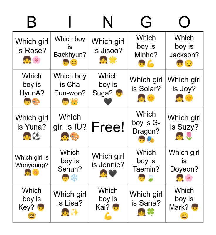 This bingo card has a free space and 30 words: Which girl is Lisa? π§β¨, Which boy is Jungkook? π¦π΅, Which girl is IU? π§π¨, Which boy is Taehyung? π¦π, Which girl is RosΓ©? π§πΈ, Which girl is Jisoo? π§π, Which boy is Cha Eun-woo? π¦π, Which girl is Jennie? π§π€, Which boy is G-Dragon? π¦π, Which boy is Kai? π¦πͺ, Which girl is Suzy? π§π·, Which boy is Mark? π¦π, Which girl is Sana? π§π, Which boy is RM? π¦π, Which girl is Joy? π§π, Which girl is Hwasa? π§πΉ, Which boy is Taemin? π¦π, Which girl is Wonyoung? π§πΌ, Which boy is Sehun? π¦βοΈ, Which boy is Jackson? π¦π, Which girl is Yuna? π§β½, Which girl is Hani? π§β¨, Which boy is Baekhyun? π¦π, Which girl is Solar? π§π, Which boy is HyunA? π¦π¨, Which boy is Minho? π¦πͺ, Which girl is Doyeon? π§πΈ, Which boy is Key? π¦π€, Which boy is Suga? π¦π€ and Which girl is Taeyeon? π§π.