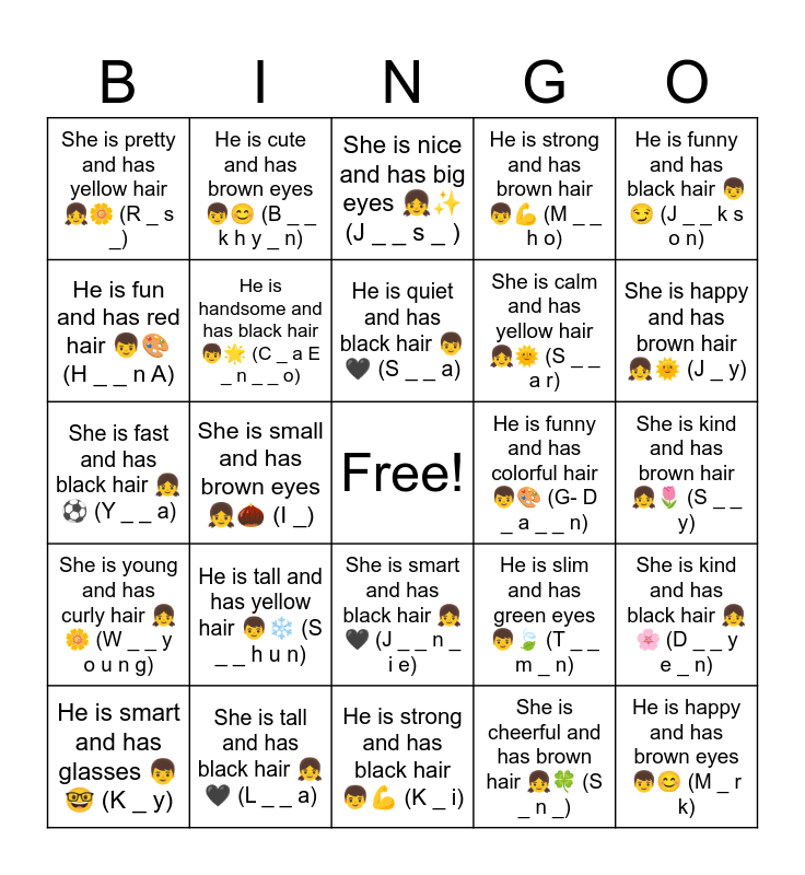 This bingo card has a free space and 30 words: She is tall and has black hair ๐ง๐ค (L _ _ a), He is strong and has brown eyes ๐ฆโก (J _ _ g k _ _ k), She is small and has brown eyes ๐ง๐ฐ (I _), He is cool and has purple hair ๐ฆ๐ (T _ _ h _ y _ n g), She is pretty and has yellow hair ๐ง๐ผ (R _ s _), She is nice and has big eyes ๐งโจ (J _ _ s _ ), He is handsome and has black hair ๐ฆ๐ (C _ a E _ n _ _ o), She is smart and has black hair ๐ง๐ค (J _ _ n _ i e), He is funny and has colorful hair ๐ฆ๐จ (G- D _ a _ _ n), He is strong and has black hair ๐ฆ๐ช (K _ i), She is kind and has brown hair ๐ง๐ท (S _ _ y), He is happy and has brown eyes ๐ฆ๐ (M _ r k), She is cheerful and has brown hair ๐ง๐ (S _ n _), He is smart and has black hair ๐ฆ๐ (R _), She is happy and has brown hair ๐ง๐ (J _ y), She is strong and has black hair ๐ง๐ช (H _ _ a s a), He is slim and has green eyes ๐ฆ๐ (T _ _ m _ n), She is young and has curly hair ๐ง๐ผ (W _ _ y o u n g), He is tall and has yellow hair ๐ฆโ๏ธ (S _ _ h u n), He is funny and has black hair ๐ฆ๐ (J _ _ k s o n), She is fast and has black hair ๐งโฝ (Y _ _ a), She is pretty and has brown hair ๐งโจ (H _ _ i), He is cute and has brown eyes ๐ฆ๐ (B _ _ k h y _ n), She is calm and has yellow hair ๐ง๐ (S _ _ a r), He is fun and has red hair ๐ฆ๐จ (H _ _ n A), He is strong and has brown hair ๐ฆ๐ช (M _ _ h o), She is kind and has black hair ๐ง๐ธ (D _ _ y e _ n), He is smart and has glasses ๐ฆ๐ค (K _ y), He is quiet and has black hair ๐ฆ๐ค (S _ _ a) and She is pretty and has black hair ๐งโจ (T _ _ y e _ n).