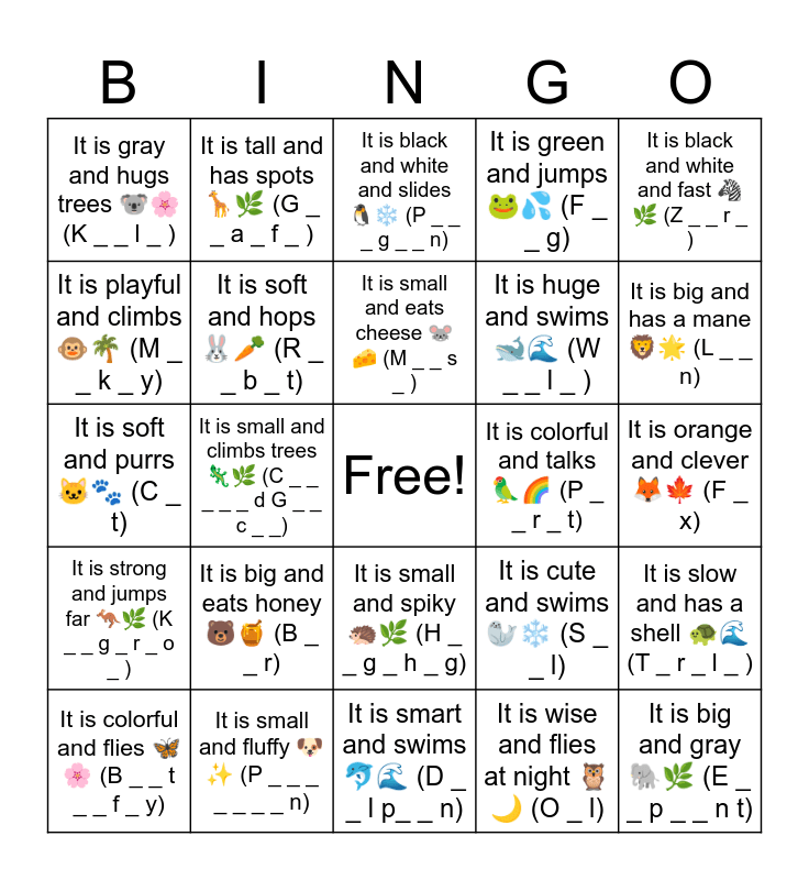 This bingo card has a free space and 30 words: It is small and fluffy πΆβ¨ (P _ _ _ _ _ _ _ n), It is cute and swims well π¦¦π (O _ _ _ r), It is small and climbs trees π¦πΏ (C _ _ _ _ _ d G _ _ c _ _), It is red and climbs trees πΌπ (R _ _ P _ _ d _ ), It is gray and hugs trees π¨πΈ (K _ _ l _ ), It is black and white and slides π§βοΈ (P _ _ _ g _ _ n), It is soft and hops π°π₯ (R _ _ b _ t), It is small and spiky π¦πΏ (H _ _ g _ h _ g), It is colorful and talks π¦π (P _ _ r _ t), It is smart and swims π¬π (D _ _ l p_ _ n), It is orange and clever π¦π (F _ x), It is big and gray ππΏ (E _ _ p _ _ n t), It is wise and flies at night π¦π (O _ l), It is small and gathers nuts πΏοΈπ° (S _ _ _ r _ e _ ), It is big and has a mane π¦π (L _ _ n), It is orange and has stripes π―π₯ (T _ g _ r), It is cute and swims π¦βοΈ (S _ _ l), It is strong and jumps far π¦πΏ (K _ _ g _ r _ o _ ), It is big and eats honey π»π― (B _ _ r), It is black and white and fast π¦πΏ (Z _ _ r _ ), It is soft and purrs π±πΎ (C _ t), It is loyal and barks πΆπΎ (D _ g), It is tall and has spots π¦πΏ (G _ _ a _ f _ ), It is huge and swims ππ (W _ _ l _ ), It is playful and climbs π΅π΄ (M _ _ k _ y), It is green and jumps πΈπ¦ (F _ _ g), It is slow and has a shell π’π (T _ r _ l _ ), It is colorful and flies π¦πΈ (B _ _ t _ _ f _ y), It is small and eats cheese ππ§ (M _ _ s _ ) and It is red and has claws π¦ποΈ (C _ _ b).
