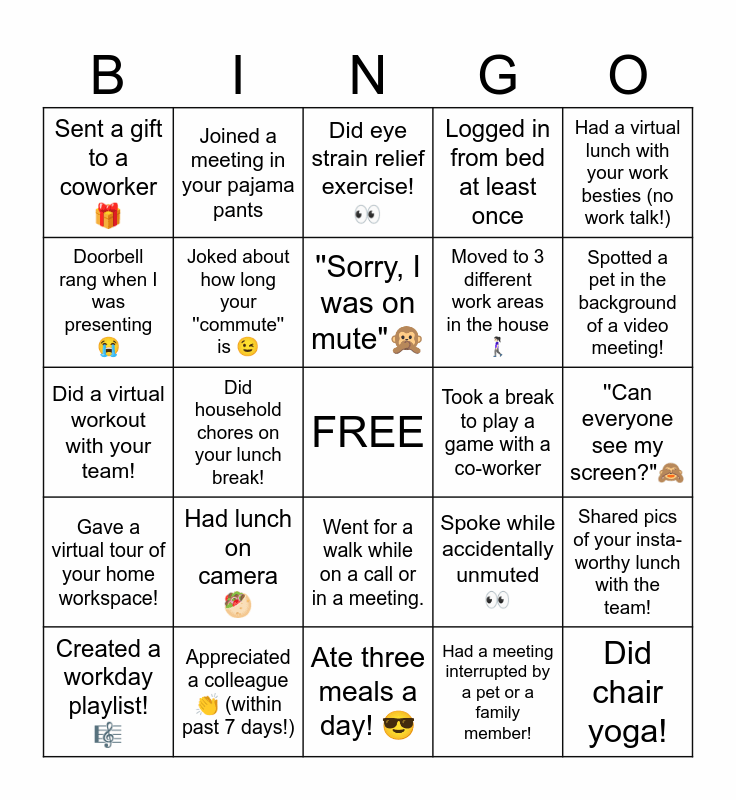 This bingo card has a free space and 24 words: Created a workday playlist! πΌ, Had lunch on camera π₯, ''Sorry, I was on mute"π, Had a meeting interrupted by a pet or a family member!, Had a virtual lunch with your work besties (no work talk!), Sent a gift to a coworkerπ, Joined a meeting in your pajama pants, Did eye strain relief exercise!π, Took a break to play a game with a co-worker, ''Can everyone see my screen?"π, Did a virtual workout with your team!, Joked about how long your ''commute'' is π, Spoke while accidentally unmuted π, Shared pics of your insta-worthy lunch with the team!, Doorbell rang when I was presenting π, Appreciated a colleague π (within past 7 days!), Ate three meals a day! π, Logged in from bed at least once, Spotted a pet in the background of a video meeting!, Gave a virtual tour of your home workspace!, Did household chores on your lunch break!, Went for a walk while on a call or in a meeting., Moved to 3 different work areas in the houseπΆπ»ββοΈ and Did chair yoga!.