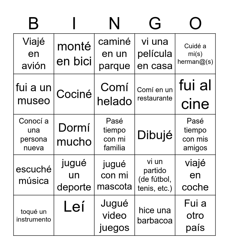 This bingo card has 30 words: Leí, vi a mis abuelos, Dormí mucho, Fui de compras, Viajé en avión, caminé en un parque, Cociné, jugué con mi mascota, Dibujé, Jugué video juegos, Pasé tiempo con mis amigos, Pasé tiempo con mi familia, hice una barbacoa, Fui a otro país, fui al cine, fui a la playa, vi un partido (de fútbol, tenis, etc.), escuché música, jugué un deporte, Cuidé a mi(s) herman@(s), Conocí a una persona nueva, nadé, monté en bici, Comí en un restaurante, fui a un museo, vi una película en casa, viajé en coche, toqué un instrumento, Comí helado and viajé en tren.