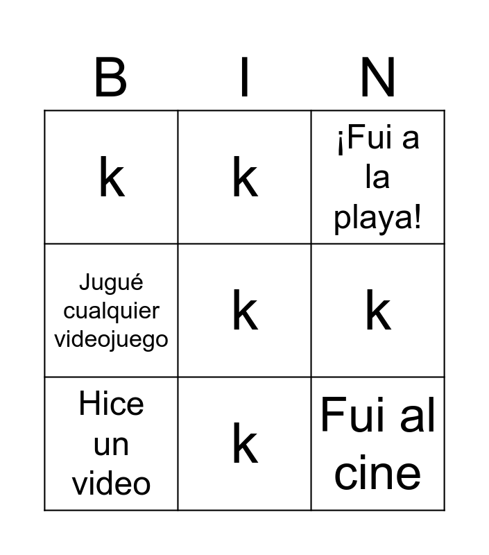 This bingo card has 26 words: k, k, k, k, k, k, k, k, k, Celebré mi cumpleaños, Fui al cine, Jugué afuera, Miré una programa de televisión nueva, Pasé tiempo con amigos en persona, Escuché música nueva, Fui a una fiesta, Jugué cualquier videojuego, Leí un buen libro, ¡Fui a la playa!, ¡Fui a otro estado para las vacaciones!, Fui a un museo, Compré ropa o zapatos nuevos, ¡Fui a otro país para las vacaciones!, Conocí a una persona nueva, Hice un video and k.