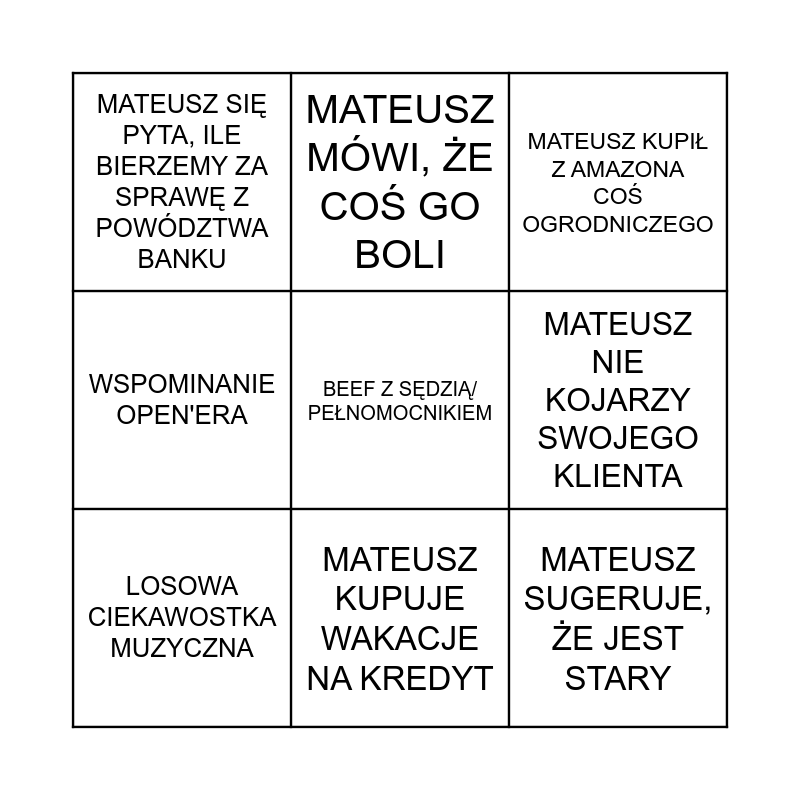 This bingo card has a free space and 8 words: MATEUSZ NIE KOJARZY SWOJEGO KLIENTA, MATEUSZ KUPIŁ Z AMAZONA COŚ OGRODNICZEGO, MATEUSZ MÓWI, ŻE COŚ GO BOLI, LOSOWA CIEKAWOSTKA MUZYCZNA, MATEUSZ SIĘ PYTA, ILE BIERZEMY ZA SPRAWĘ Z POWÓDZTWA BANKU, MATEUSZ SUGERUJE, ŻE JEST STARY, WSPOMINANIE OPEN'ERA and MATEUSZ KUPUJE WAKACJE NA KREDYT.