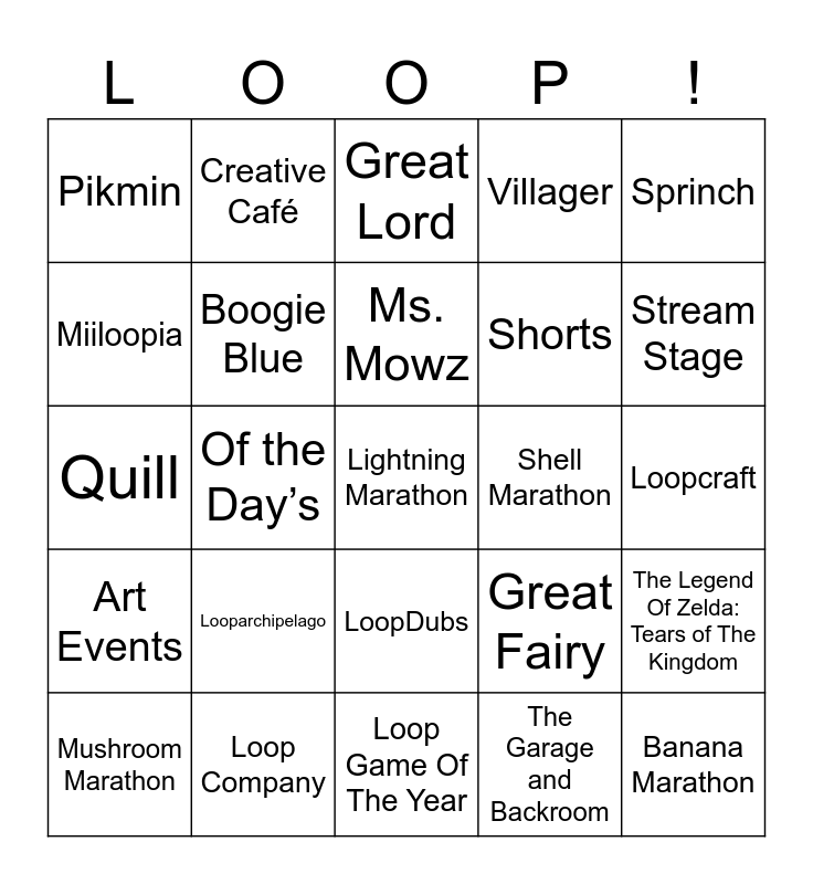 This bingo card has 78 words: Nintendo Loop, Guardians, Great Lord, High Lord, Lord, Nitro Boo-Ster, Spirit, Boo, Gym Leader, Subrosian, Star Warrior, Inkling, Villager, Pikmin, Hall Of Frame, Miiloopia, NL Error DataBase, Looparchipelago, Objections, Loopcraft, Booyah, Sprinch, Quill, Ms. Mowz, Boogie Blue, Pink Huu, Boogie Huu, Official Events, 24/7 Stream, GBA Update, Stream Stage, Loop Hunger Games, Loop Game Of The Year, Banana Marathon, Mushroom Marathon, Shell Marathon, Flower Marathon, Leaf Marathon, Star Marathon, Lightning Marathon, Special Marathon, Personal Event, Notes, August 29th 2020, Requests, Creative Café, Backlog Binge, Loopdachi, Kirby and the Forgotten Land, Metroid Dread, The Legend Of Zelda: Tears of The Kingdom, Of the Day’s, Great Fairy, Mario Kart Weekly Hangout, Loop Town, Fan Art Gallery, Moments, Easter Egg/Snowflake Competition, VGT Club, LoopDubs, Shorts, Birthday Spotlight, Role Corner, Server Partners, Note Shop, Discord, Mario & Luigi: Brothership, Lucky Lord, Art Events, Loop Company, Final Fantasy Raids, Splatoon Events, Jackbox Parties, Shiny Hunts, The Garage and Backroom, Lord & Fairy Beats, Pokedex Trivia and Nia & Dromarch.