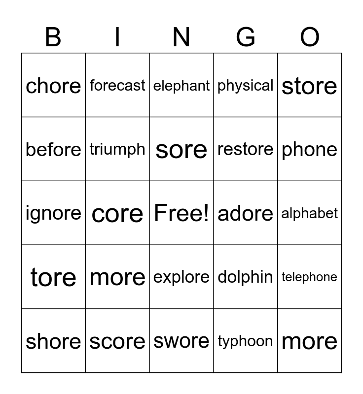 This bingo card has a free space and 24 words: more, score, sore, shore, store, chore, before, forecast, adore, explore, restore, ignore, dolphin, telephone, triumph, typhoon, alphabet, elephant, phone, core, more, tore, physical and swore.