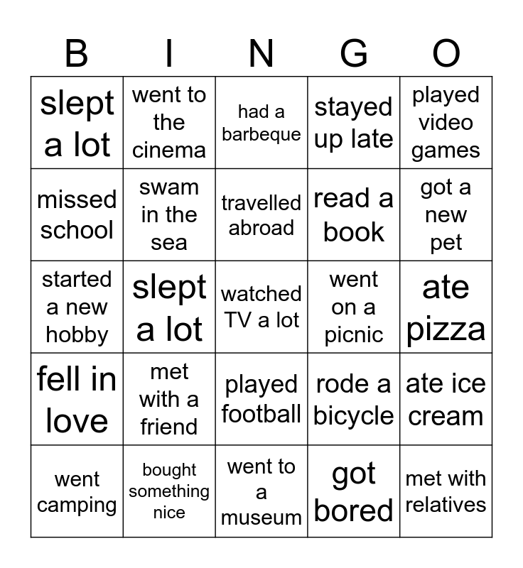 This bingo card has a free space and 24 words: met with a friend, bought something nice, travelled abroad, went camping, played video games, slept a lot, missed school, went to the cinema, went on a picnic, played football, read a book, started a new hobby, rode a bicycle, ate ice cream, swam in the sea, got bored, ate pizza, had a barbeque, got a new pet, slept a lot, met with relatives, fell in love, stayed up late and went to a museum.