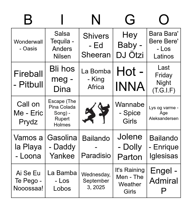 This bingo card has a free space and 31 words: Wednesday, September 3, 2025, 12:25 PM, Escape (The Pina Colada Song) - Rupert Holmes, Don't Stop Believin' - Journey, Wonderwall - Oasis, Shivers - Ed Sheeran, Bli hos meg - Dina, Jolene - Dolly Parton, Wannabe - Spice Girls, It's Raining Men - The Weather Girls, Lys og varme - Åge Aleksandersen, Engel - Admiral P, Innerst I sjelen - Sissel, I'm gonna be (500 miles), Last Friday Night (T.G.I.F), Boombastic - Shaggy, Bailando - Enrique Iglesisas, Gasolina - Daddy Yankee, Vamos a la Playa - Loona, Bailando - Paradisio, Bara Bara' Bere Bere' - Los Latinos, Ecuador - Sash!, Ai Se Eu Te Pego - Nooossaa!, Salsa Tequila - Anders Nilsen, Hot - INNA, Fireball - Pitbull, Hey Baby - DJ Ötzi, Call on Me - Eric Prydz, La Bamba - Los Lobos, La Bomba - King Africa and Barcelona - Paperboys.