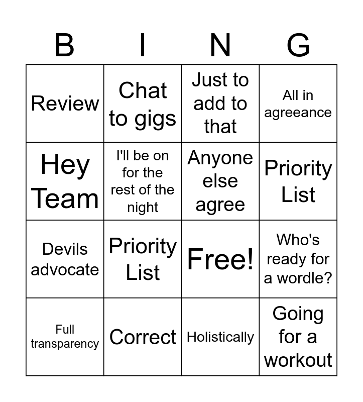 This bingo card has 21 words: Correct, To the point, Chat to gigs, Honest, Holistically, Anyone else agree, Review, Just to add to that, Free!, Priority List, Devils advocate, All in agreeance, Going for a workout, What's the command?, I'll be on for the rest of the night, Reference point, Full transparency, Priority List, Hey Team, Who's ready for a wordle? and Leave it with me.