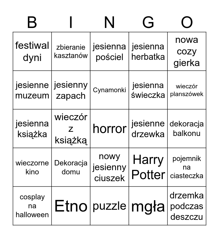 This bingo card has a free space and 24 words: Dekoracja domu, Etno, Cynamonki, cosplay na halloween, nowa cozy gierka, festiwal dyni, jesienne muzeum, zbieranie kasztanów, jesienne drzewka, nowy jesienny ciuszek, jesienna świeczka, jesienna książka, Harry Potter, pojemnik na ciasteczka, jesienny zapach, mgła, dekoracja balkonu, jesienna pościel, wieczór planszówek, wieczór z książką, drzemka podczas deszczu, wieczorne kino, jesienna herbatka and puzzle.