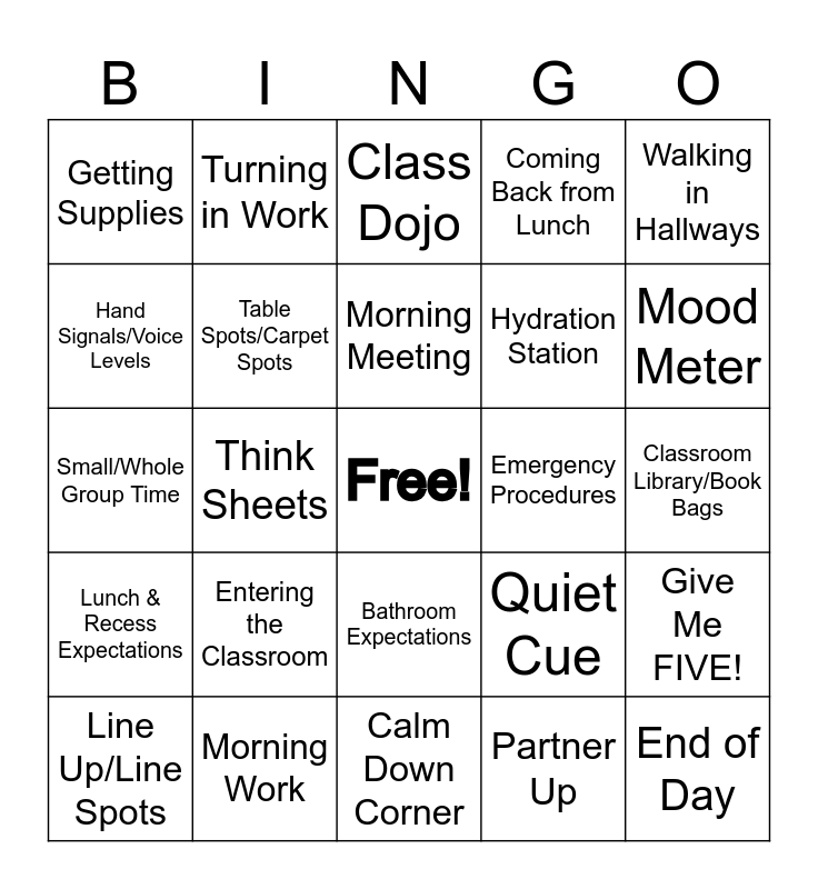 This bingo card has a free space and 24 words: Entering the Classroom, Morning Work, Morning Meeting, Line Up/Line Spots, Walking in Hallways, Getting Supplies, Hand Signals/Voice Levels, Turning in Work, Emergency Procedures, Bathroom Expectations, Hydration Station, Small/Whole Group Time, Quiet Cue, Give Me FIVE!, Table Spots/Carpet Spots, Partner Up, Classroom Library/Book Bags, Class Dojo, Mood Meter, Think Sheets, End of Day, Lunch & Recess Expectations, Coming Back from Lunch and Calm Down Corner.