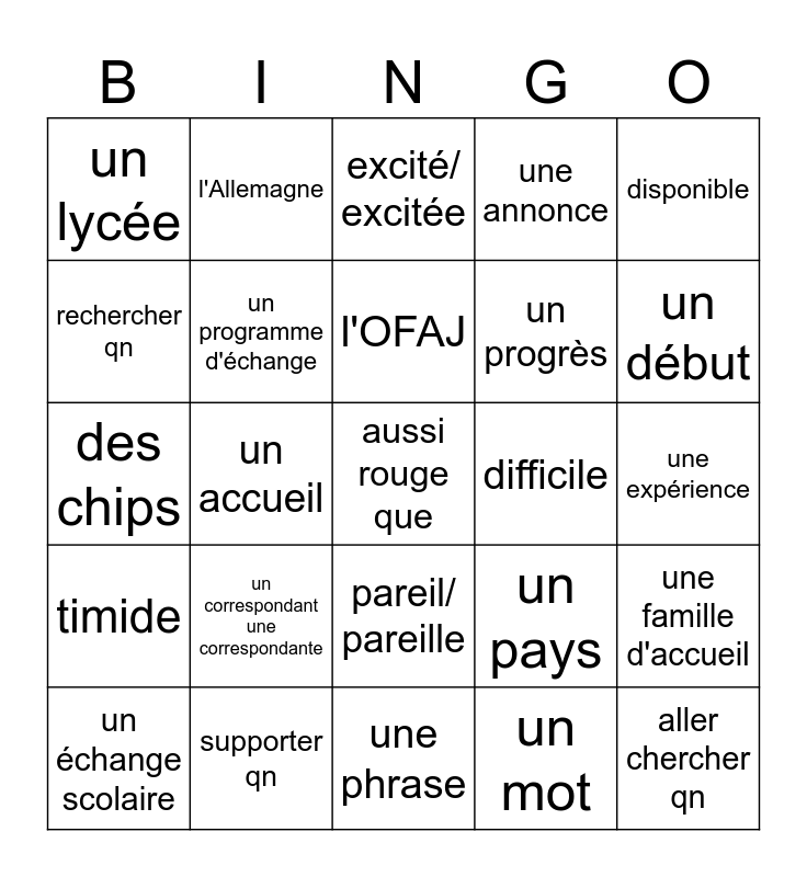 This bingo card has a free space and 29 words: un échange scolaire, plusieurs, un accueil, un séjour, un lycée, excité/ excitée, un programme d'échange, un correspondant une correspondante, difficile, supporter qn, une expérience, aller chercher qn, une phrase, un mot, un début, le skate, pareil/ pareille, timide, disponible, des chips, un pays, le mal de pays, un progrès, rechercher qn, une annonce, l'Allemagne, une famille d'accueil, l'OFAJ and une annonce.