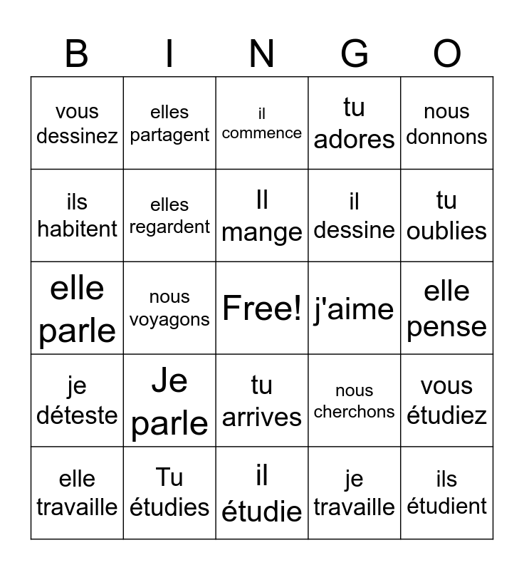 This bingo card has a free space and 24 words: Je parle, Tu étudies, Il mange, elle travaille, nous donnons, vous dessinez, ils habitent, elles partagent, j'aime, tu arrives, il dessine, elle parle, nous cherchons, vous étudiez, elles regardent, je travaille, elle pense, il commence, tu oublies, nous voyagons, ils étudient, je déteste, tu adores and il étudie.