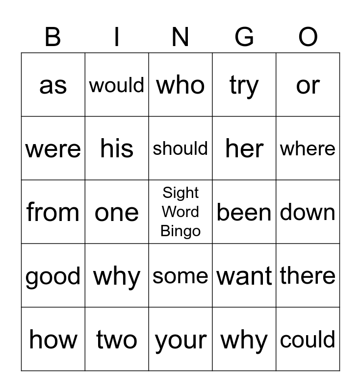 This bingo card has a free space and 24 words: why, two, should, how, or, as, were, would, been, some, her, from, want, there, his, why, down, who, where, one, could, good, try and your.