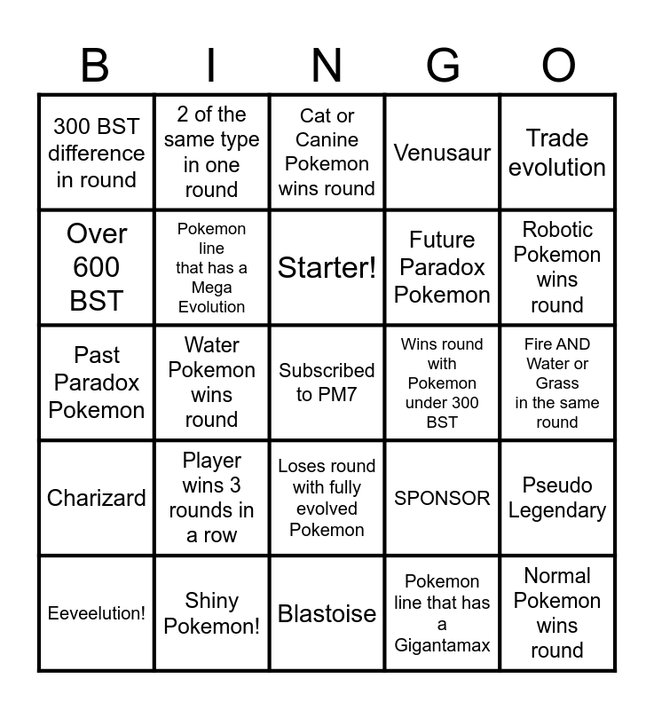 This bingo card has a free space and 24 words: Player wins 3 rounds in a row, Shiny Pokemon!, Starter!, Eeveelution!, Trade evolution, 300 BST difference in round, Over 600 BST, 2 of the same type in one round, Wins round with Pokemon under 300 BST, Loses round with fully evolved Pokemon, Future Paradox Pokemon, Past Paradox Pokemon, SPONSOR, Pseudo Legendary, Pokemon line that has a Mega Evolution, Pokemon line that has a Gigantamax, Fire AND Water or Grass in the same round, Cat or Canine Pokemon wins round, Robotic Pokemon wins round, Water Pokemon wins round, Normal Pokemon wins round, Charizard, Venusaur and Blastoise.
