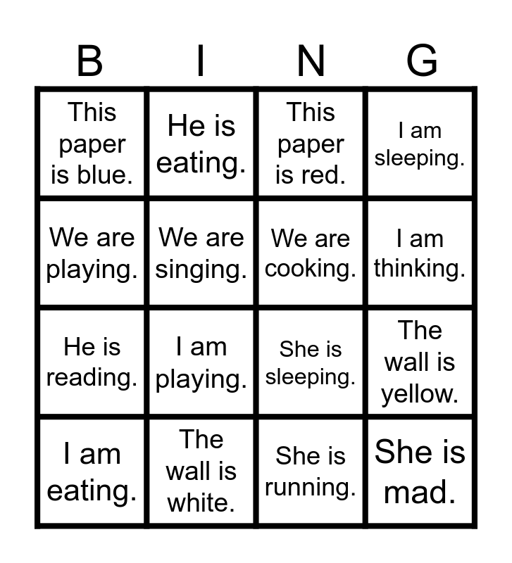 This bingo card has 16 words: The wall is white., The wall is yellow., This paper is red., This paper is blue., He is reading., He is eating., She is sleeping., She is running., We are playing., We are singing., I am eating., I am sleeping., I am playing., I am thinking., We are cooking. and She is mad..