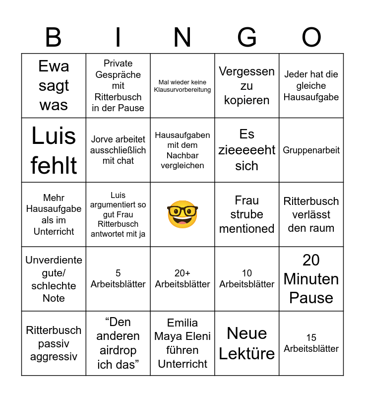 This bingo card has a free space and 24 words: 5 Arbeitsblätter, “Den anderen airdrop ich das”, Hausaufgaben mit dem Nachbar vergleichen, Ritterbusch passiv aggressiv, Jeder hat die gleiche Hausaufgabe, Ewa sagt was, Luis fehlt, Private Gespräche mit Ritterbusch in der Pause, Frau strube mentioned, 20+ Arbeitsblätter, Es zieeeeeht sich, Mehr Hausaufgabe als im Unterricht, 10 Arbeitsblätter, 20 Minuten Pause, Jorve arbeitet ausschließlich mit chat, Neue Lektüre, Ritterbusch verlässt den raum, Mal wieder keine Klausurvorbereitung, Gruppenarbeit, Luis argumentiert so gut Frau Ritterbusch antwortet mit ja, 15 Arbeitsblätter, Unverdiente gute/ schlechte Note, Vergessen zu kopieren and Emilia Maya Eleni führen Unterricht.